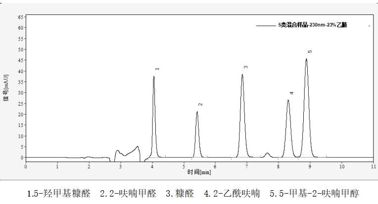 工業_DAD230nm_Supersil ODS2 5μm_5-羥甲基糠醛、糠醇、糠醛、2-乙酰呋喃、5-甲基-2-呋喃甲醇