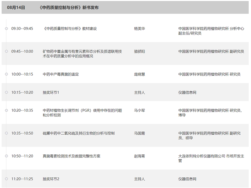 《中藥質量控制與分析》新書發布會,特邀專著主編及核心章節編委,為中藥質量控制與分析的專業技術人員,講解編撰背景、意義與由來,并選取核心章節進行剖析。旨在對從事相關領域的學生及專業技術人員提供深入系統的專業知識,講授科研經驗,共同推進中藥使用的有效與安全,為進一步提升中藥質量,實現中藥標準化、現代化盡力。