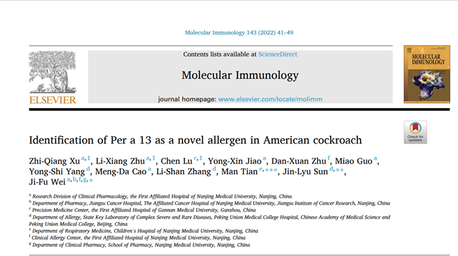 《Molecular Immunology》是國際免疫學領域權威期刊之一,由世界著名的學術出版商Elsevier公司出版發行,是美國SCI 數據庫收錄的核心期刊,2021年影響因子為4.4?!禡olecular Immunology》致力于免疫學研究領域的各個方向,尤其注重在細胞水平、生物化學水平及遺傳學水平,深入揭示各種免疫學現象的機制。在《Molecular Immunology》143(2022)41-49發表的《Identification of Per a 13 as a novel allergen inAmerican cockroach》一文中,首次在美洲大蠊(蟑螂的一種)中鑒定到一個屬于甘油醛3-磷酸脫氫酶(GAPDH)類型的過敏原,被國際組織認定為Per a 13。