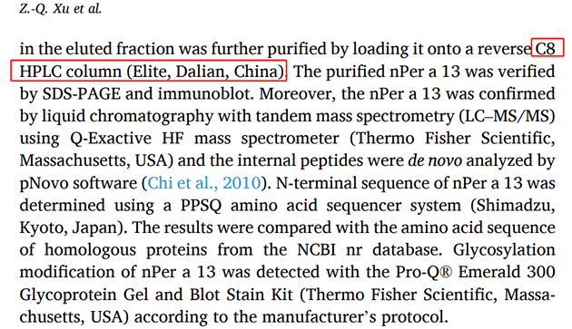 蟑螂是一類重要的室內致敏物質來源,暴露于蟑螂過敏原與免疫球蛋白E介導的過敏性疾病密切相關。Per a 13為動物源性吸入性過敏原的一個全新類型,有助于用于蟑螂過敏診斷和治療。上面論文中Per a 13的純化,使用的是依利特的SinoChrom C8 10μm,10.0 mm×250 mm色譜柱,純化效果好,得到的樣品純度高。