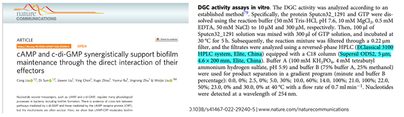 英國大綜合類期刊Nature Communications,創刊于2010年,是首個冠名“Nature”品牌的純開放獲取刊物,由英國Nature Publishing Group出版社出版發行。Nature Communications致力于發表生物、醫學、健康、物理、化學和地球科學等各領域的高質量研究。據統計2022年該雜志的影響因子為14.91。該期刊在13期1493(2022)發表一篇《cAMP and c-di-GMP synergistically support biofilm maintenance through the direct interaction of their effectors》文章。該文章提供了在細菌中cAMP和c-di-GMP通路之間通過效應物直接相互作用的證據,并表明cAMP-CRP可以在翻譯后發揮調節作用。其中DGC體外活性測定中核苷酸檢測分析使用的就是依利特的EClassical系列液相色譜儀以及依利特Supersil系列色譜柱。