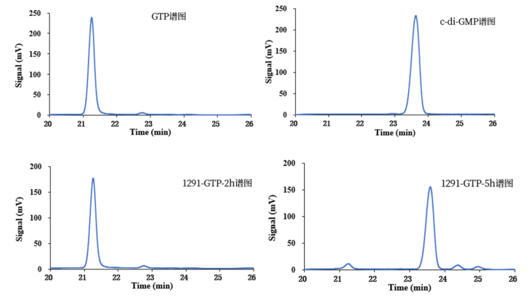 通過依利特EClassical 3100液相色譜儀搭配經典Superisil ODS2色譜柱,對樣品中核苷酸進行實時檢測。結果顯示,隨著時間的推移,樣品中的GTP逐漸轉化成了c-di-GMP,而GTP轉化成c-di-GMP的體外催化過程需要活性DGC的參與。因此,該實驗表明:該樣品中含有活性DGC。