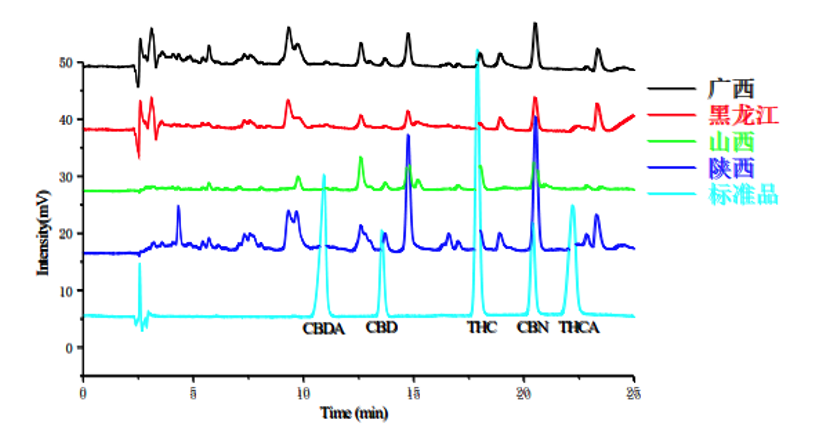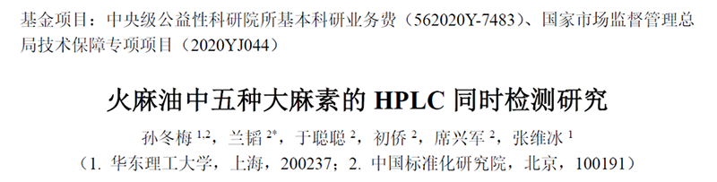 基于此標準,華東理工大學與中國標準化研究院的研究生們使用依利特iChrom 5100高效液相色譜儀和經典的Supersil ODS2色譜柱,在國家市場監督管理總局技術保障專項項目中,完成了火麻油中五種大麻素的HPLC 同時檢測研究。