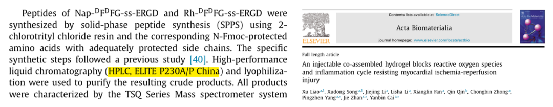 英國著名工程技術-材料科學和生物材料類期刊Acta Biomaterialia在2022年7月刊登一篇《An injectable co-assembled hydrogel blocks reactive oxygen species and inflammation cycle resisting myocardial ischemia-reperfusion injury》文章。該文章設計并制備了一種可注射的共組裝水凝膠體系,通過阻斷活性氧和炎癥循環抵抗心肌缺血再灌注傷害。其中人工合成多肽的分析純化使用的就是依利特的P230A/P分析-半制備一體化液相色譜系統及SinoChrom ODS-BP 系列的半制備色譜柱。