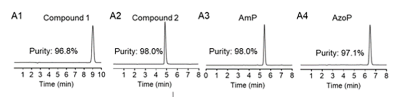 通過依利特EClassical 3100液相色譜儀對AzoP、AmP的純度進行檢測,峰形良好,并且分離度高,并且測得的結果分別為:AmP的純度為98%,AzoP的純度為97.1%。
