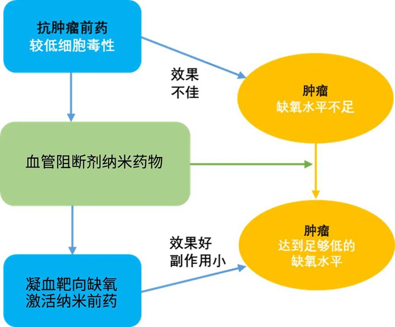 缺氧是實體腫瘤的共同特征,被認為是腫瘤治療的佳靶點之一。但是實體腫瘤細胞中的缺氧水平往往達不到選擇性激活腫瘤治療藥物的需求。如果在遞送腫瘤治療藥物的同時,能夠遞送加劇腫瘤區域缺氧的藥物,就能更有效地靶向治療,精準地在目標腫瘤區域差異化地激活治療藥物,讓腫瘤藥物療效顯著增長,同時還能有效降低藥物在體內代謝循環過程中的毒副作用和風險。