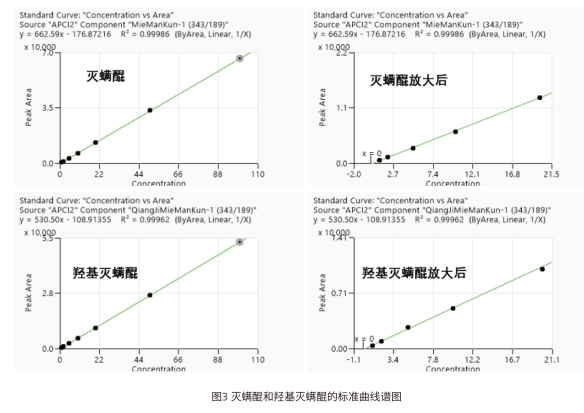 本文采用 EClassical 3200L-MS2 Vertical 9100 三重四極桿液質聯用系統,建立了快速、高靈敏度且可靠的 LC-MS/MS 方法,用于測定食品中滅螨醌和羥基滅螨醌,為該類化合物提供了高通量檢測手段,檢出限完全滿足相關標準要求。滅螨醌:y=530.50x-108.91355,R2=0.99962;羥基滅螨醌:線性方程及 R2 詳見完整譜圖,R2≥0.999)