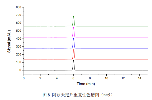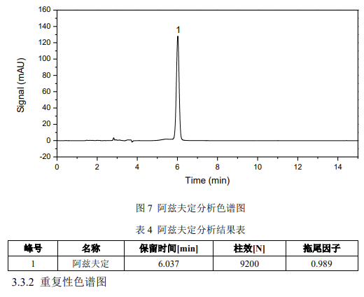樣品溶液配制:取供試品 1 藥品 1 粒,稱量質量為 0.1477g,取部分后研磨,稱取質量為 0.0287g,用 2mL 甲醇溶解,離心,取上層清液,濾過;量取 0.5mL 上述溶液,量取乙腈 / 水 = 10:90 的溶液 0.5mL 將其稀釋,得含供試品 1 濃度為 7.175mg/mL 的供試品溶液 1。按每粒藥品含阿茲夫定 1mg 計算,供試品溶液 1 中的阿茲夫定含量為 0.049mg/mL。