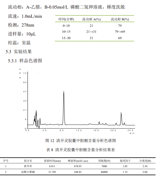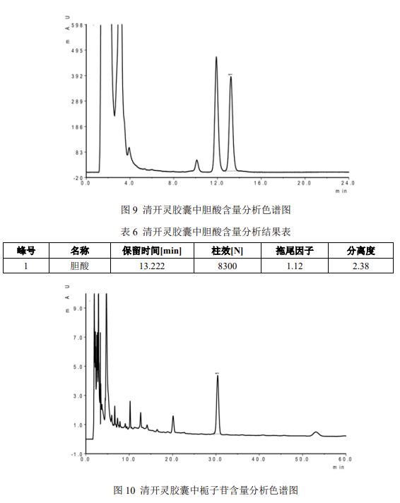 依利特使用新款的 EClassical 3200 液相色譜儀搭配 Supersil ODS2 和 SinoChrom ODS-BP 色譜柱,對清開靈膠囊中膽酸、梔子苷、黃芩苷含量進行了分析檢測,結果顯示目標物柱效高、峰形好,滿足定性定量分析的需求。