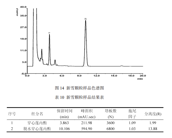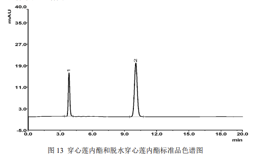 依利特使用新款的 EClassical 3200 液相色譜儀搭配 Hypersil ODS2 色譜柱,對新雪顆粒中穿心蓮內酯和脫水穿心蓮內酯進行了分析檢測,結果顯示目標物峰形良好,柱效高,可以達到基線分離,滿足定性定量分析的需求。
