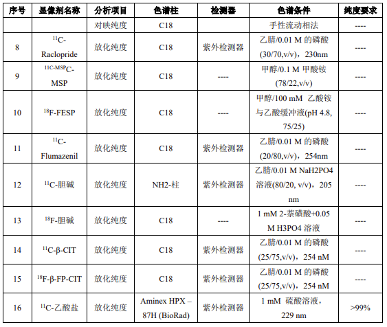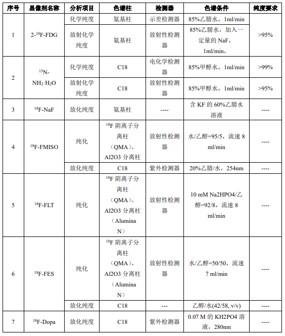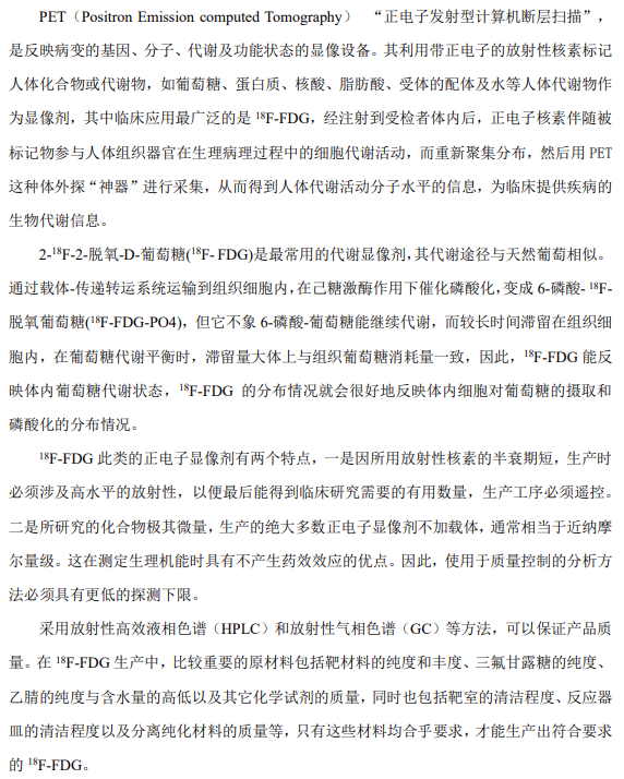 \(^{18}\text{F}\)是載于美國藥典的第一個 PET 放射性藥物,需要對放射性核純度、化學純度、放射化學純度、比活度等質量指標進行控制,同時需要對合成反應的副產物含量進行控制,而液相色譜法是進行\(^{18}\text{F}\)-FDG 化學純度分析的好方法。