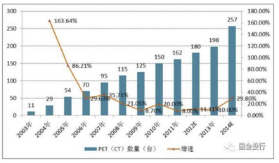 正是 PET-CT 在部分領域的獨特效用,國內裝機數量不斷增長。根據相關普查情況,自本世紀初西安萬杰長信醫院(現已更名 “長安醫院”)購買了中國大陸第一臺 PET-CT 設備,中國 PET-CT 的數量已經增長到 2014 年的 257 臺,年均復合增長率超過 30%。