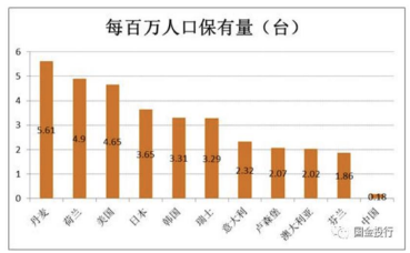 從保有量看,丹麥每百萬人口 PET-CT 保有量高,達到 5.61 臺 / 每百萬人,相比之下中國只有 0.18 臺 / 每百萬人,排名靠前的 10 個國家中,少的芬蘭也有 1.86 臺 / 每百萬人,設備數量方面有 10 倍多的提升空間。