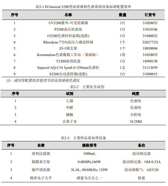 實驗過程中其它玻璃器皿還包括容量瓶 (100mL、50mL、25mL、10mL)、具塞錐形瓶 (250mL)、移液槍 (0~1000μL,0~5000μL)、移液槍槍頭 (1mL,5mL)、一次性 PVC 手套、一次性口罩、進樣針、濾膜等若干。