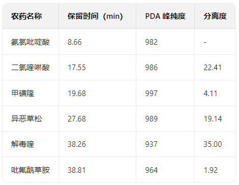 6 種農藥實現基線分離,分離度均>1.5,峰純度優異,關鍵參數如下:
