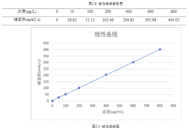 采用濃度分別為 0 μg/L?50 μg/L?100 μg/L?200 μg/L?400 μg/L?600 μg/L?800 μg/L 的丙烯酸標品按 2.3.3 實驗條件,所得數據及線性曲線如下: