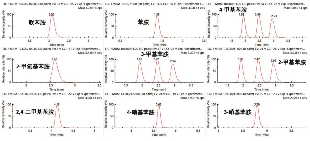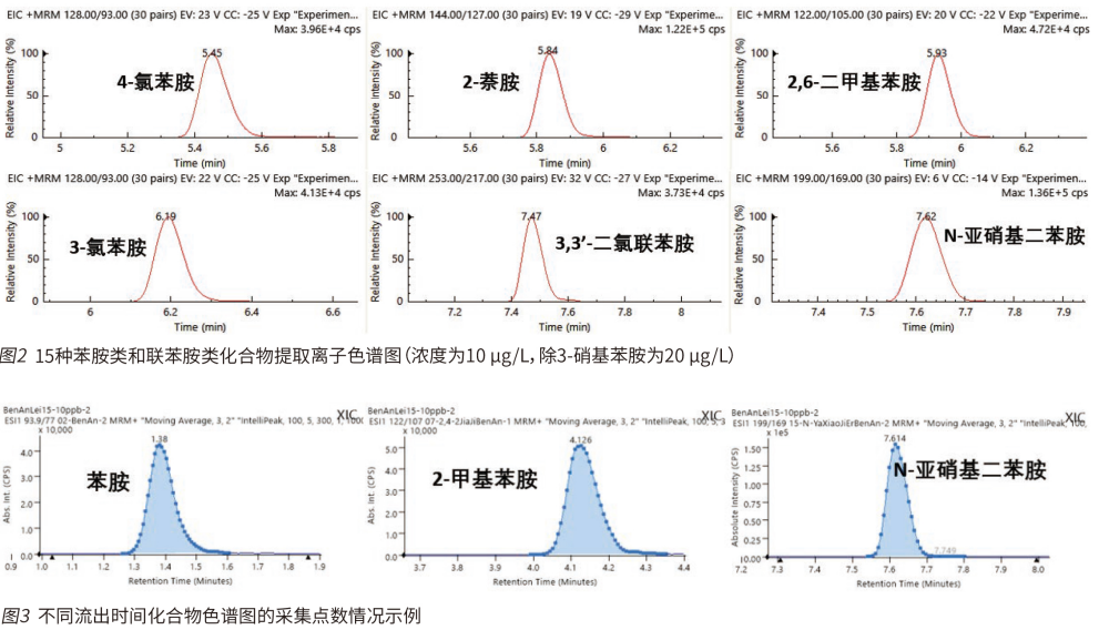 本方法采用一針進樣同時測定 13 種苯胺類和 2 種聯苯胺類化合物,圖 1 和圖 2 中分別展示了 15 種化合物的 MRM 疊加譜圖和提取離子色譜圖。可見各個化合物的峰型對稱,所有異構體均取得良好的分離,并保證每個色譜峰上有足夠的采集點數,以便獲得準確的結果及優異的重復性。