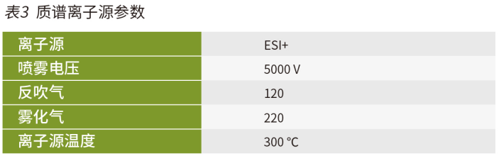 采用 Elite MSVertical 9100 三重四極桿液質聯用系統進行分析,離子源參數及目標化合物質譜參數見表 2 和表 3。