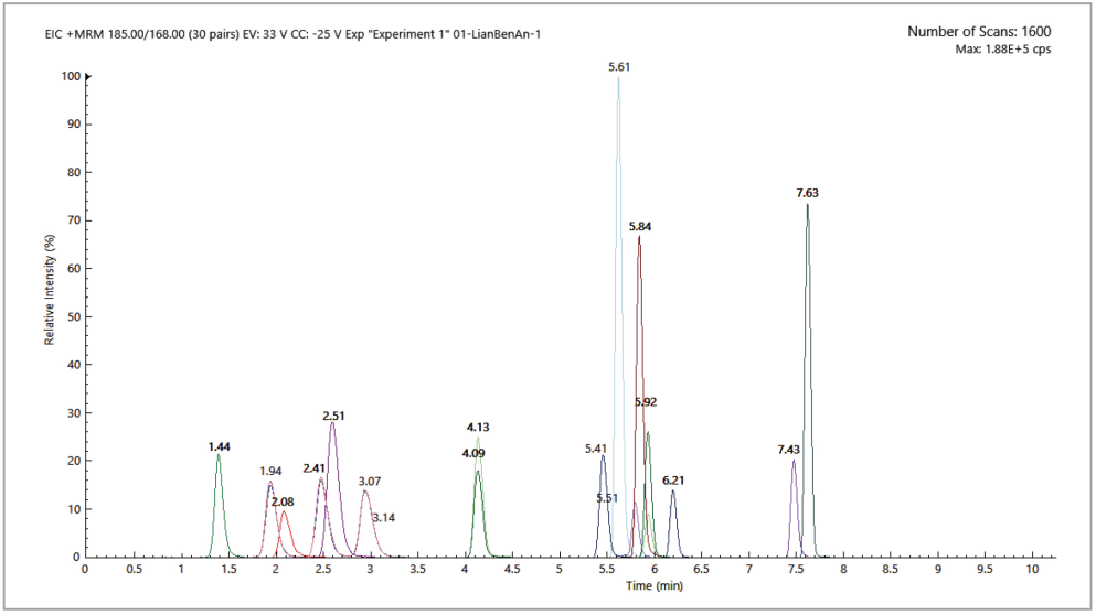 目前,我國生態環境部發布標準 HJ1210-2021《土壤和沉積物 13 種苯胺類和 2 種聯苯胺類化合物的測定 液相色譜 - 三重四極桿質譜法》,為環境介質中土壤和沉積物中苯胺類和聯苯胺類化合物的測定提供技術保障和法規依據。本文針對該標準,依利特科技采用 EClassical 3200L-MS2 Vertical 9100 液質聯用系統,成功建立了土壤和沉積物中 15 種苯胺類和聯苯胺類化合物的分析方案,根據保留時間及離子比率進行快速準確定性,其檢出限完全滿足標準中的檢測限量要求,輕松應對日常檢測分析要求。