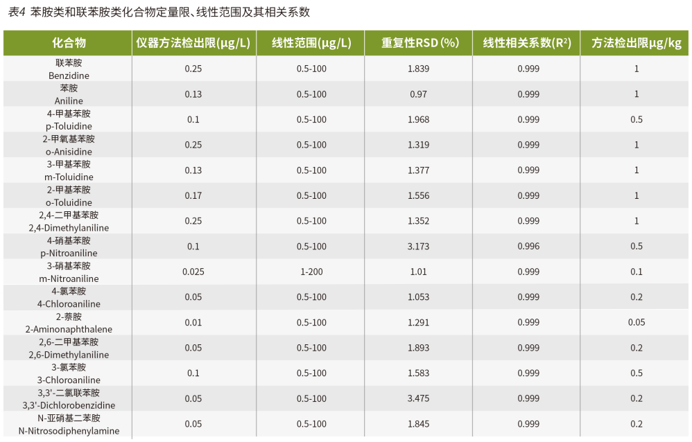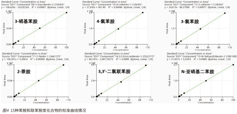 用含 25% 的甲醇水溶液稀釋 15 種苯胺類和聯苯胺類化合物的混合標準溶液,制成 0.5μg/L-100μg/L 的系列校準標準溶液,其中除 3 - 硝基苯胺為 1μg/L-200μg/L,并繪制標準曲線。圖 4 為 15 種化合物的標準曲線情況。其中各個化合物在線性范圍內,線性關系均較好,相關系數 R 均大于 0.995。同時考察了儀器方法的檢出限及定量限濃度的 6 針重現性測試(見表 4),實驗結果表明,該儀器方法對于測定 15 種化合物具有優異的線性及重現性,以及較高的靈敏度。