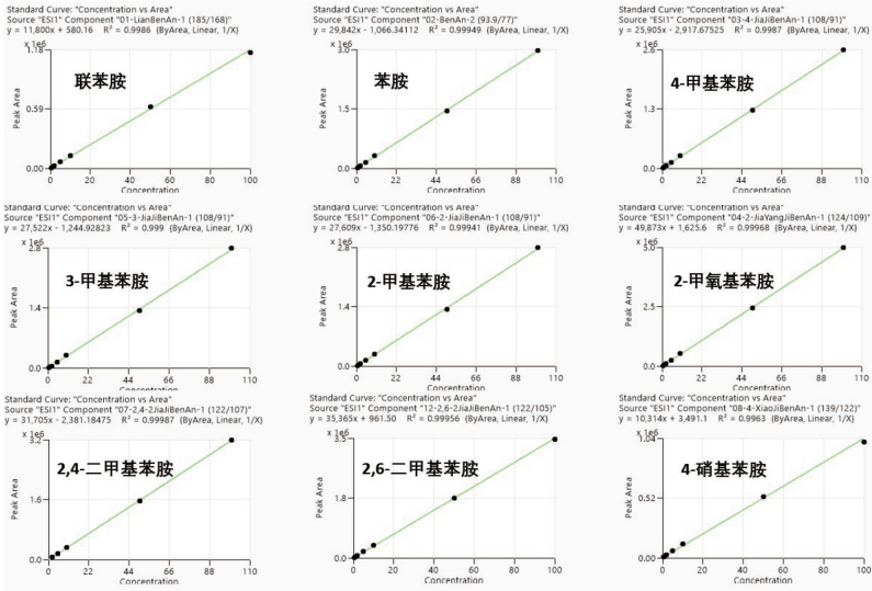 本文采用 EClassical 3200L-MS2 Vertical 9100 三重四極桿液質聯用系統建立了快速、高靈敏度和可靠的 LC-MS/MS 實驗方法測定土壤和沉積物中 15 種苯胺類和聯苯胺類化合物的含量。本方法具有分析速度快、靈敏度高等特點,且檢出限低于 HJ 1210-2021《土壤和沉積物 13 種苯胺類和 2 種聯苯胺類化合物的測定 液相色譜 - 三重四極桿質譜法》標準中限量的要求,同時數據顯示,其重復性和線性均較好,為后期高通量的樣品測定提供可靠的保障。