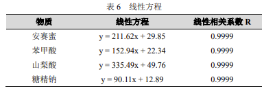 配制濃度分別為 5μg/mL、10μg/mL、20μg/mL、30μg/mL、40μg/mL、50μg/mL、100μg/mL 的標準工作液,按濃度由低至高進樣,以標準品濃度為橫坐標,峰面積為縱坐標,繪制校準曲線,安賽蜜、山梨酸、糖精鈉混合標準品的線性相關性結果如下: