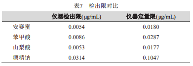 噪聲按 0.01mV 計算,峰高為 3 倍信噪比對應的濃度為儀器檢出限,10 倍信噪比對應的濃度為儀器定量限,結果如下表所示: