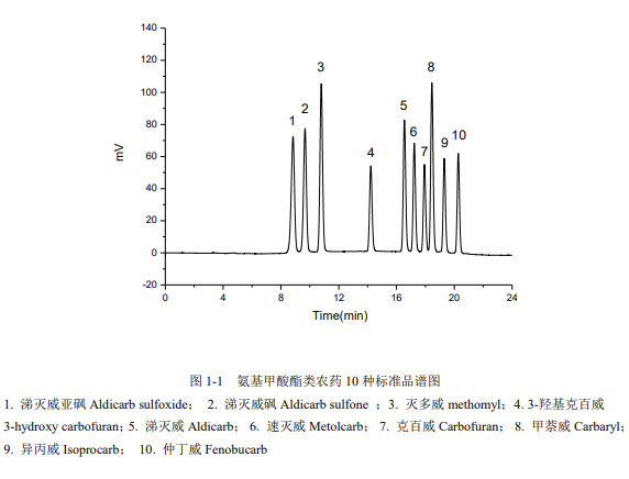 (橫坐標為時間 min,縱坐標為信號 mV;標注 10 種農藥峰:1. 涕滅威亞砜、2. 涕滅威砜、3. 滅多威、4.3 - 羥基克百威、5. 涕滅威、6. 速滅威、7. 克百威、8. 甲萘威、9. 異丙威、10. 仲丁威)
