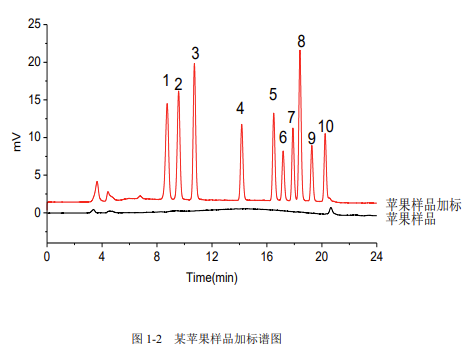 (橫坐標為時間 min,縱坐標為信號 mV;含 “蘋果樣品”“蘋果樣品加標” 兩條曲線,標注 10 種農藥對應峰)