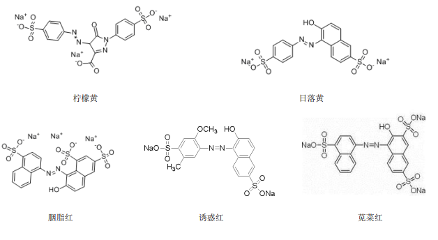 合成著色劑可分為偶氮類和非偶氮類兩種結構。在酸堿條件下,兩種結構的合成著色劑均穩定。按著色劑的溶解性可分為脂溶性著色劑和水溶性著色劑,脂溶性著色劑由于不溶于水,在體內不易排出,毒性較大等原因,在食品行業已經不允許添加,現在世界各國使用的合成著色劑大部分為水溶性偶氮類著色劑。