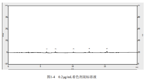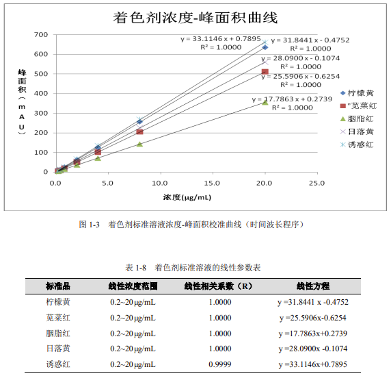 配制濃度分別為 0.2μg/mL、0.4μg/mL、0.8μg/mL、2.0μg/mL、4.0μg/mL、8.0μg/mL、20.0μg/mL 的著色劑混標工作液,按濃度由低至高進樣,以標準品濃度為橫坐標,峰面積為縱坐標,繪制校準曲線,著色劑的標準溶液線性相關性結果如下。