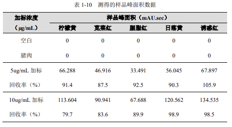 本系統的基線噪聲為 25μV,根據 3 倍信噪比,儀器的小檢出限分別為檸檬黃 20ng/mL,莧菜紅 22ng/mL,胭脂紅 33ng/mL,日落黃 20ng/mL,誘惑紅 17ng/mL。根據前處理方法計算,各目標物的方法檢出限分別為檸檬黃 12.5μg/kg,莧菜紅 13.8μg/kg,胭脂紅 20.6μg/kg,日落黃 12.5μg/kg,誘惑紅 10.6μg/kg。