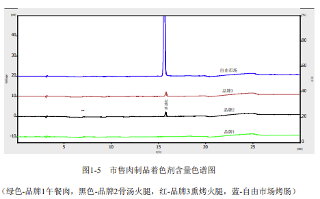 按照上述方法對市場上的幾種肉制品中著色劑的含量情況分析結果如下: