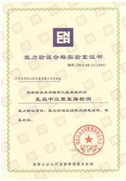 大連依利特分析儀器有限公司作為國內知名廠家,秉承著 “質量更佳、服務更優、創新更快” 的理念,二十年來為食品安全、藥品檢測及高校應用等眾多行業提供著完善的分析方法及先進的儀器配置。從蘇丹紅、孔雀石綠到 “三鹿奶粉三聚氰胺” 事件,關系著國計民生的 “食品安全” 問題一次次為我們敲響警鐘,并引起社會廣泛關注。針對 “三聚氰胺” 事件,依利特人在第一時間做出反應,榮獲由國家認證認可監督管理委員會頒發的 “能力驗證合格實驗室證書”,并且按照 GB/T 22388-2008《原料乳與乳制品中三聚氰胺檢測方法》、GB/T 22400-2008《原料乳中三聚氰胺快速檢測 液相色譜法》的國家標準,在經過大量實驗驗證后,提供出符合國標的三聚氰胺檢測解決方案,包括分析方法驗證及推薦儀器配置在內的全套解決方案。