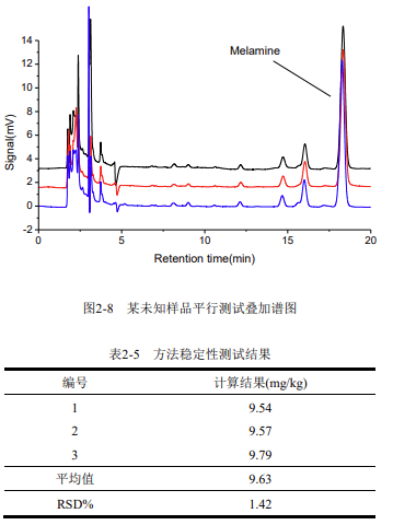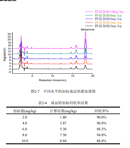 樣品測試過程中,應保證其三聚氰胺含量在該線性范圍之內,若超出該范圍,需將樣品進一步稀釋或濃縮。