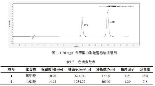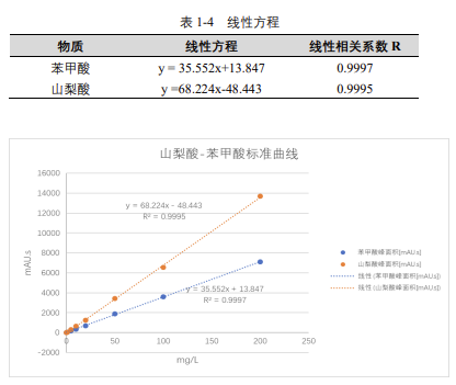 由表 1-4 可知,按照本解決方案提供的儀器及檢測方法進行分析,苯甲酸和山梨酸在 2-200mg/L 的濃度范圍內,線性良好,相關系數在 0.999 以上。
