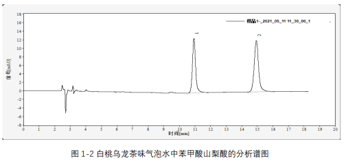 取市售某品牌白桃烏龍茶味氣泡水樣品,按照 1.2 中所述方法進行前處理及分析,所得譜圖如圖 1-3 所示: