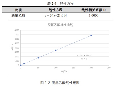由表 2-4 可知,按照本解決方案提供的儀器及檢測方法進行分析,脫氫乙酸在 5-200μg/mL 的濃度范圍內,線性良好,相關系數達 1.0000。