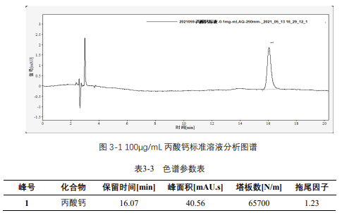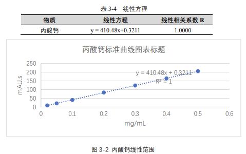 由表 3-4 可知,按照本解決方案提供的儀器及檢測方法進行分析,丙酸鈣在 20-500μg/mL 的濃度范圍內,線性良好,相關系數達 1.0000。