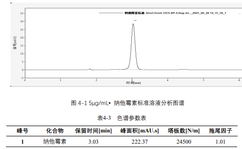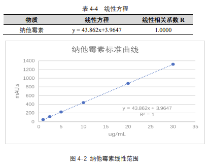 由表 4-4 可知,按照本解決方案提供的儀器及檢測方法進行分析,納他霉素在 1-30μg/mL 的濃度范圍內,線性良好,相關系數達 1.0000。