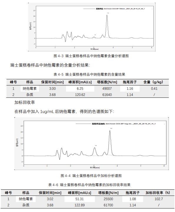 參考標準:GB/T 21915-2008《食品中納他霉素的測定 液相色譜法》,分析瑞士蛋糕卷中納他霉素的含量