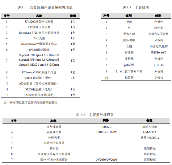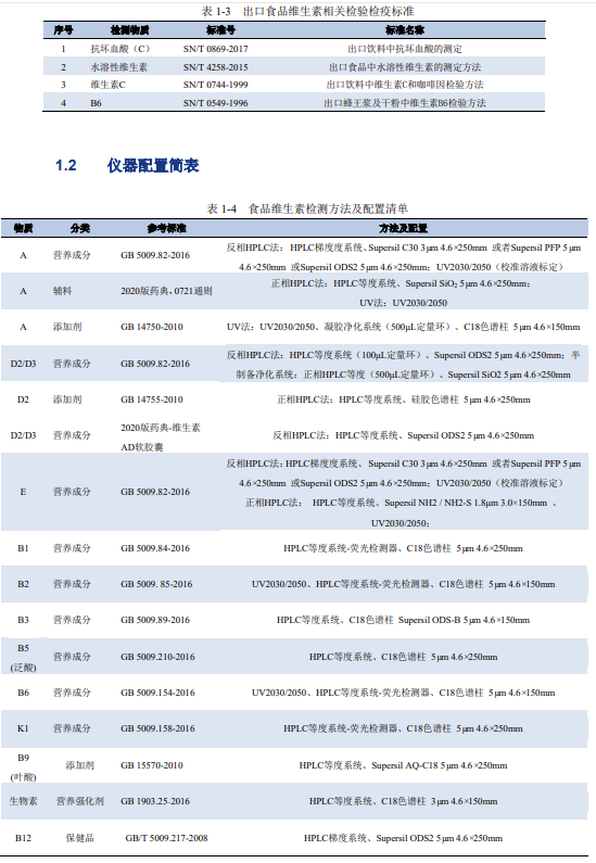 附錄文件:GB 5009 系列、GB 14750 等標準原文節選、維生素標準溶液校正詳細步驟、耗材訂貨清單(色譜柱、試劑、濾膜型號編碼)。