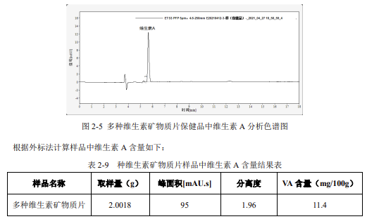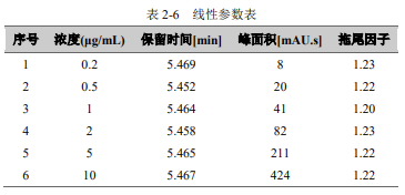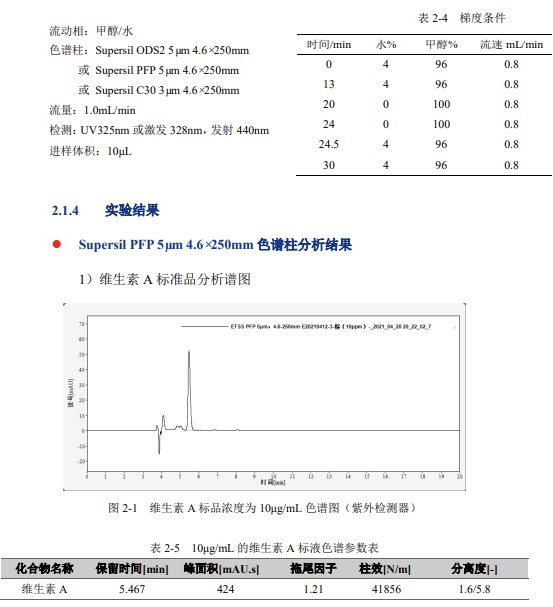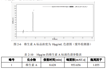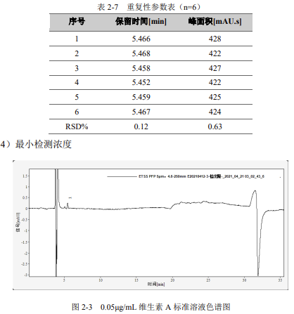 重復性:用濃度為 10μg/mL 維生素 A 標準溶液,連續進樣 6 針,峰面積和保留時間 RSD 結果如下:
