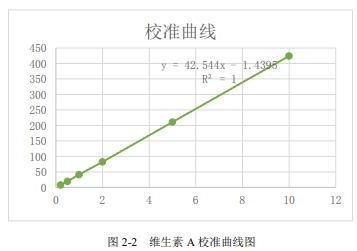 根據濃度和峰面積數據,得到維生素 A 的線性曲線方程為:y=42.544x - 1.4395,R^{2}=1.000。因此維生素 A 在 0.2~10μg/mL 濃度范圍內,線性關系良好。