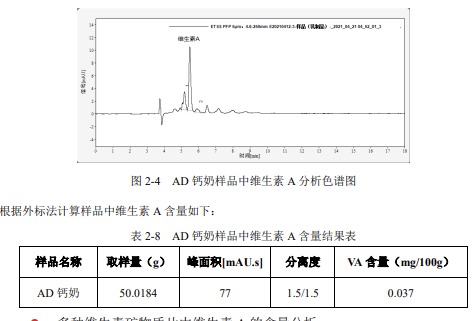 該色譜條件下,儀器的基線噪音為 0.0302mAU,根據信噪比S/N=3,計算得到維生素 A 的儀器小檢測濃度為 0.017μg/mL,實際方法檢出限為 3.5μg/100g,比國標的方法檢出限 10μg/100g,靈敏度高了不少。實際樣品分析AD 鈣奶樣品中維生素 A 的含量分析