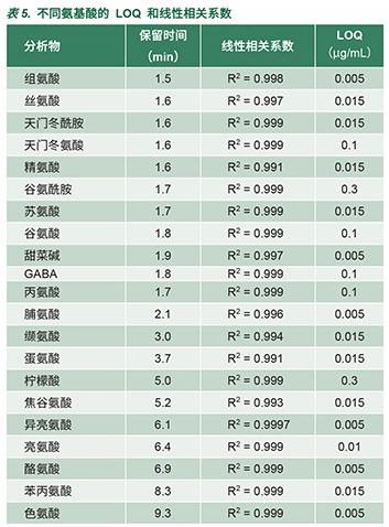 線性與檢出限:所有氨基酸線性相關系數 R2 均 > 0.98(部分如天門冬酰胺 R2=0.999),LOQ(定量限)低(低 0.005μg/mL,如組氨酸、甜菜堿、脯氨酸等),滿足微量分析需求(詳見表 5);