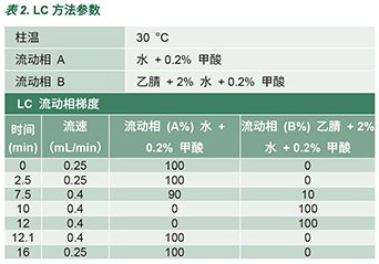 LC 參數:柱溫 30℃;流動相 A 為 “水 + 0.2% 甲酸”,流動相 B 為 “乙腈 + 2% 水 + 0.2% 甲酸”;梯度洗脫程序按時間調整流速與 A/B 比例(詳見表 2);