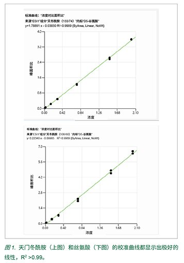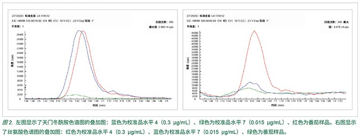 代表性數據:天門冬酰胺、絲氨酸等氨基酸的校準曲線線性優異(見圖 1),不同濃度校準品與番茄樣品的色譜圖重疊度高,分離效果清晰(見圖 2)。