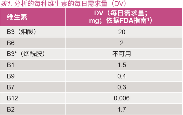 由于美國食品藥品監督管理局 (FDA) 制定了這些維生素的每日營養推薦值,因此食品和補充劑生產商以及獨立檢測實驗室需要能夠定量鑒定該類產品中的維生素含量。在進行強化食品分析時,由于維生素濃度范圍較廣,與每日容許攝取量保持一致尤其具有挑戰性 (見表 1)。例如,在嬰兒牛奶中,維生素 B12 (氰鈷維生素) 的濃度為 1-2ppb,而維生素 B2 (核黃素) 的濃度則高達 1000 倍 (1-2 pm)。因此,任何定量分析方法都必須能夠適應這種廣泛的濃度分布。