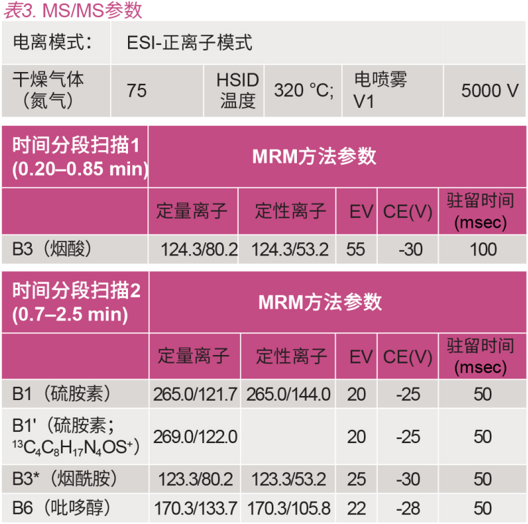LC 和 MS/MS 方法參數分別見表 2 和表 3。